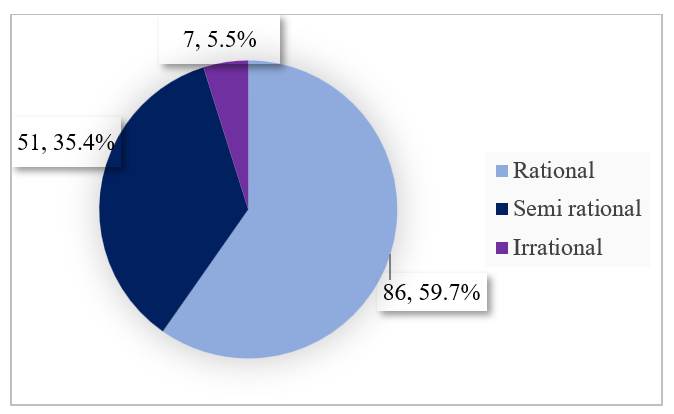 The rationality of prescriptions was assessed using Phadke’s criteria. Out of 144 prescriptions reviewed, 86 (59.7%) were classified as rational, 51 (35.4%) as semi-rational, and 7 (5.5%) as irrational ([Fig. 1]). The average rationality score across all prescriptions, regardless of their classification, was 25.38 ± 4.24.