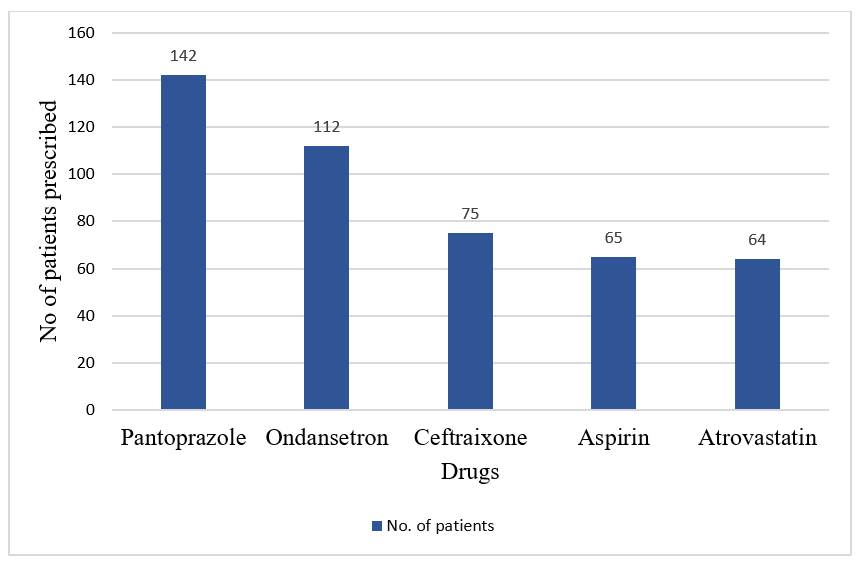 Among the most frequently prescribed medications, 142 prescriptions had Pantoprazole (98.6%), 112 included Ondansetron (77.7%), 75 had Ceftriaxone (52.0%), 68 included Aspirin (47.2%), and 64 contained Atorvastatin (44.4%) ([Fig. 2]). Ceftriaxone was the most commonly prescribed antibiotic.