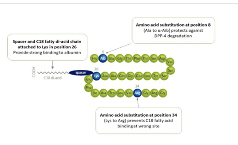Semaglutide is a structurally modified analogue of human GLP-1, incorporating specific amino acid substitutions and acylation with a C18 fatty-diacid side chain to enhance albumin binding and resist degradation by dipeptidyl peptidase-4 (DPP-4)[7]. These modifications prolong its half-life, enabling once-weekly dosing and sustained activation of GLP-1 receptors, thereby improving therapeutic adherence and metabolic efficacy[7].